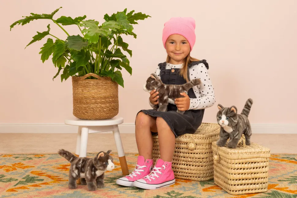 This house cat is ideal for playing! The cuddly cat is made of particularly soft material, so it is also a great snuggly partner. It is made of high-quality plush and filled with fluffy polyester stuffing made from 100% recycled material. Lifelike, sweet expression will make this little kitty a favorite!
