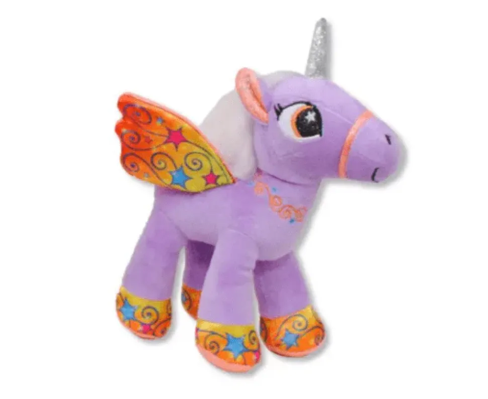 These plush unicorns with wings are sure to color any child’s world with loads of fanciful fun! The soft plush unicorns come in assorted colors, pink/blue/purple or white. Special features include iridescent wings and matching horns. Hooves, ears, harness, and shooting star appliqué are all made of a coordinating shimmery material. Sparkly eyes and rainbow-colored mane and tail complete the fantastical look.