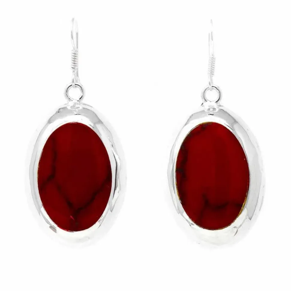 Handcrafted silver-plated oval earrings with man-made red jasper. Earring drop is 1.5″. Sterling silver loops.