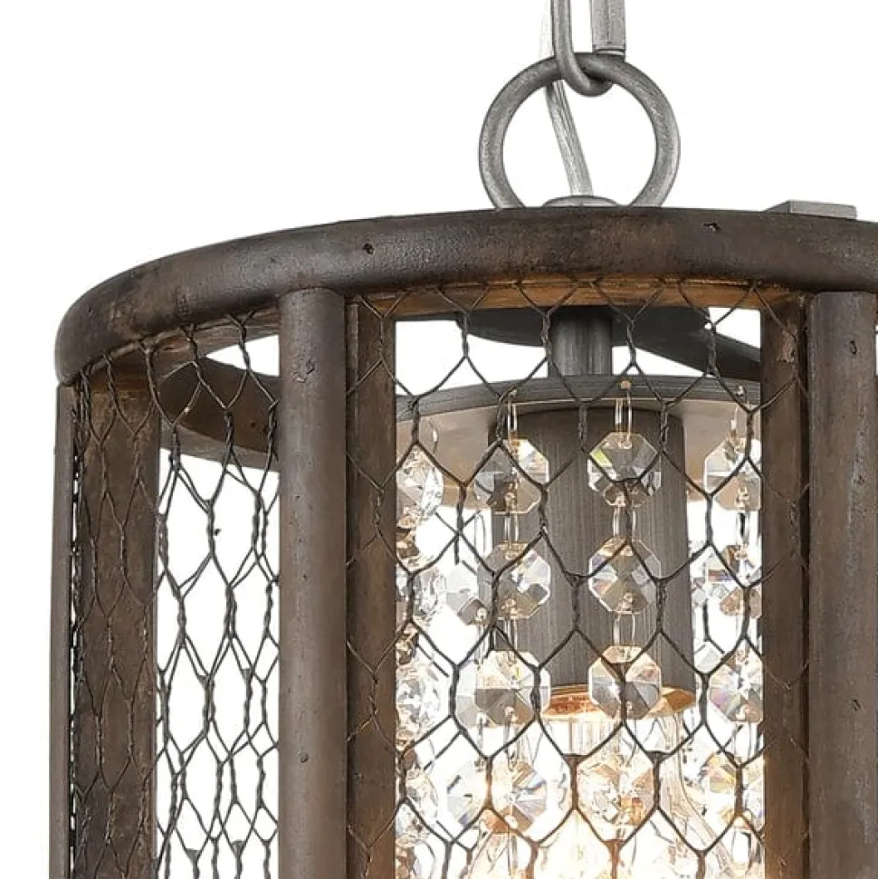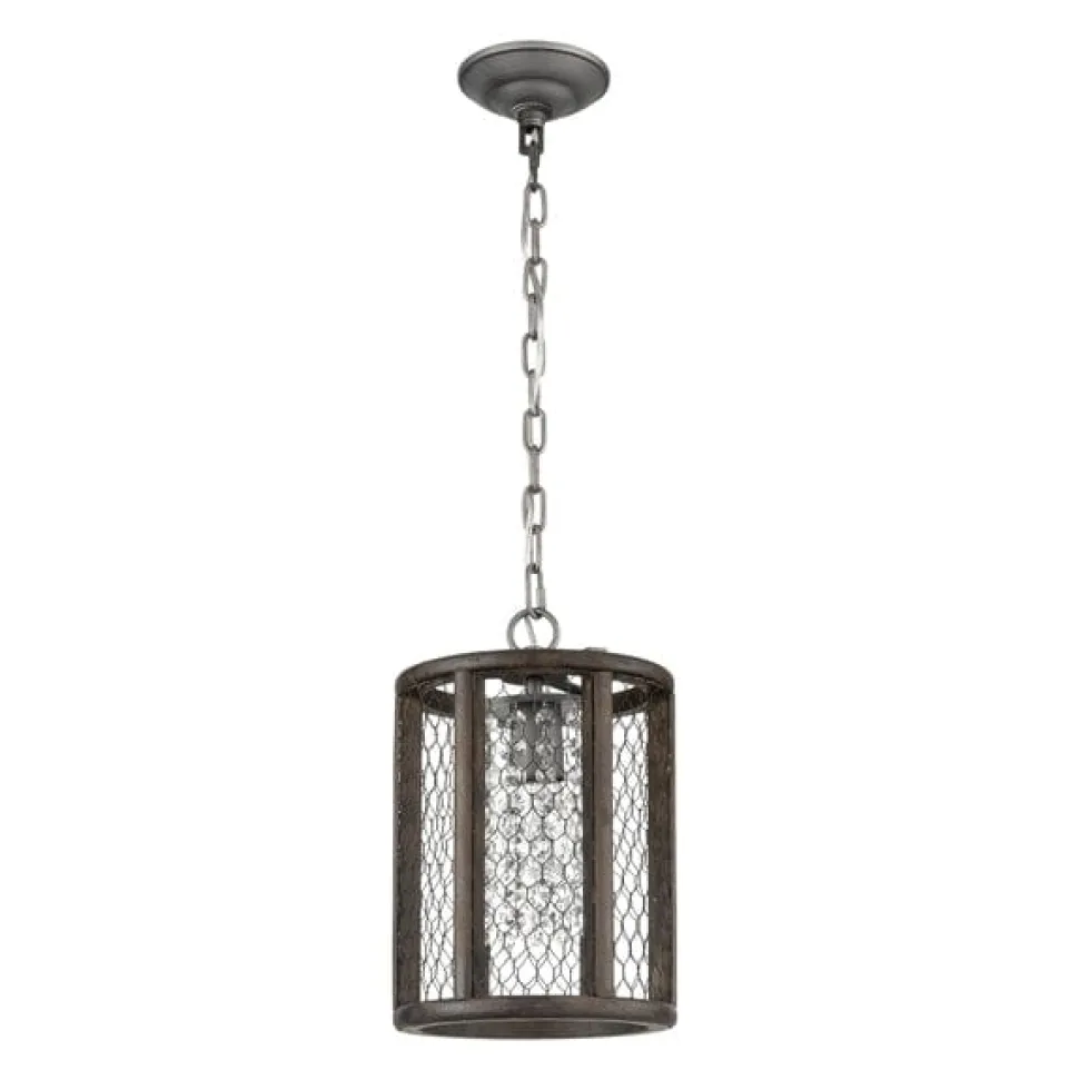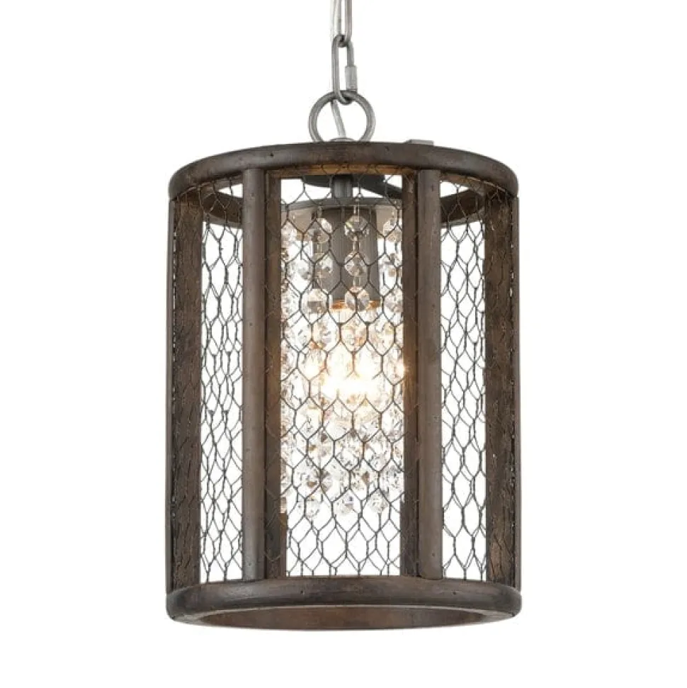 Weathered look, zinc wire mesh surrounds this single drop pendant light. Held within an aged finish, wooden frame and suspended on a chain fitting, this lighting fixture speaks of mixing elements of country style living with contemporary ingenuity. The mesh around the light throws a burst of shadows adding to a cozy ambiance and transforming its surroundings.