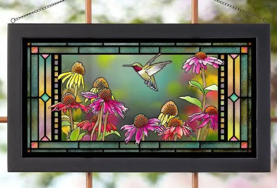 Bring the beauty of a ruby-throated hummingbird and colorful cone flowers into your home with this stained-colored glass panel artwork by Bourdet. The playful 13″X23″ piece will brighten up any room and can be hung in front of your favorite window for a colorful, whimsical touch.