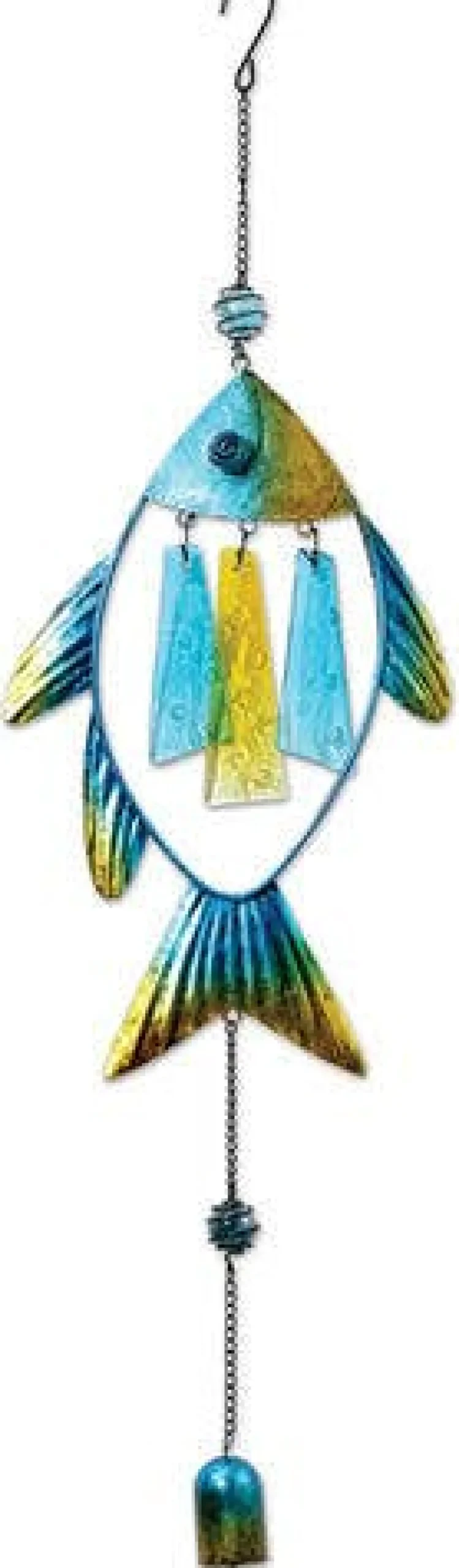 The fish is blue and green glass with vibrant metal to match, and when the sun hits it the colors pop even more! It also includes a hanging bell that creates a gentle sound in the wind.
