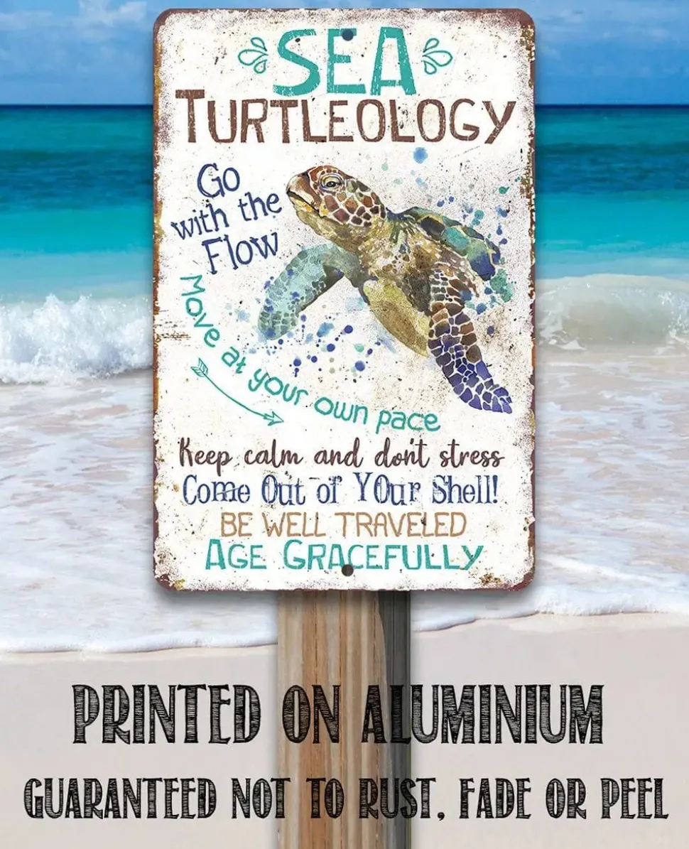 Sea Turtleology – Durable Metal Sign – 8″ x 12″ or 12″ x 18″ Use Indoor/Outdoor – Housewarming Gift The Perfect Gift – A truly unique gift guaranteed to bring a smile Durable – 8″ x 12″ or 12″ x 18″ Aluminum metal sign printed with epoxy ink so you can proudly hang it inside or outside Easy to Hang – Comes with two screw holes and it’s light enough to be mounted with double-sided foam tape or Command Strips
