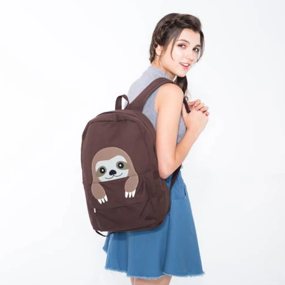 Peeking Baby Sloth Canvas Backpack. 19″ maximum backpack strap drop. Secure zipper closure; 1 zippered and 2 slip exterior pockets. Fabric lined interior with 1 zippered and 1 slip pockets. 12″ x 6″ x 17″. In stock ready to ship!