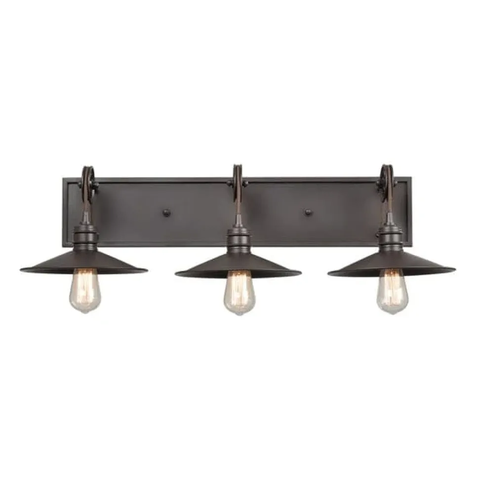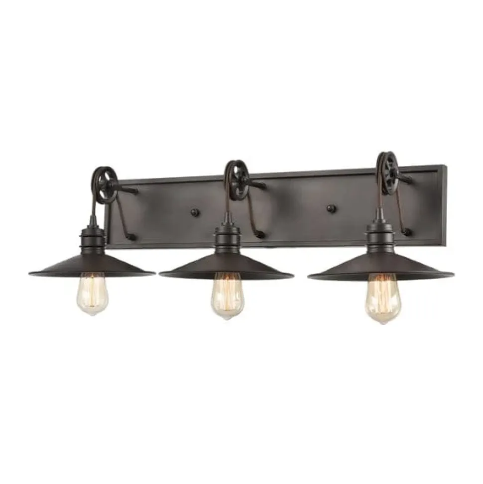 The Spindle Wheel 3 light vanity light has large pulleys inspired by early 1900’s design and cast canopy and socket holder for added vintage style. Finished in Oil Rubbed Bronze.