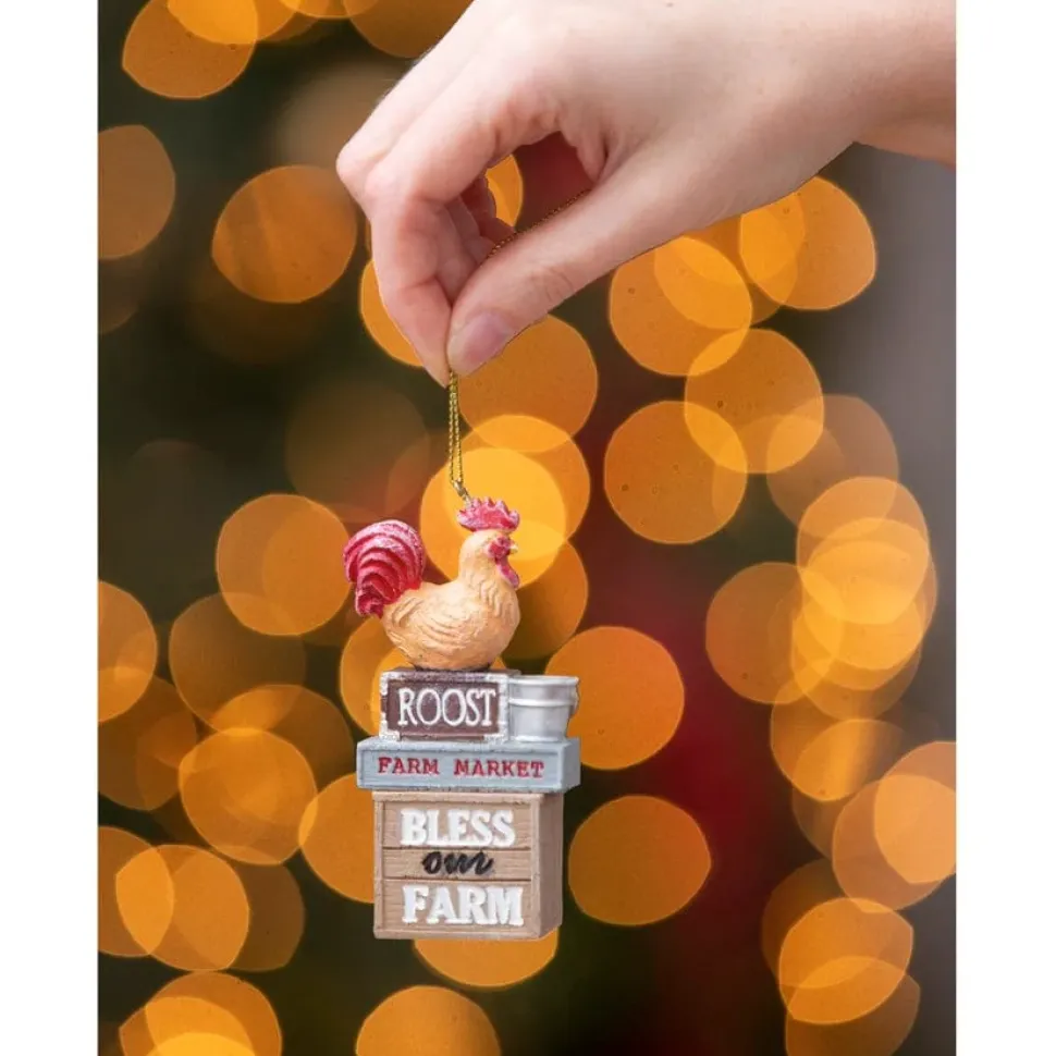 Make your farmhouse holidays merry & bright with these adorable resin farm animal ornaments. Set includes the farm animal stack of a cow, pig and Rooster with “Bless Our Farm” perch.