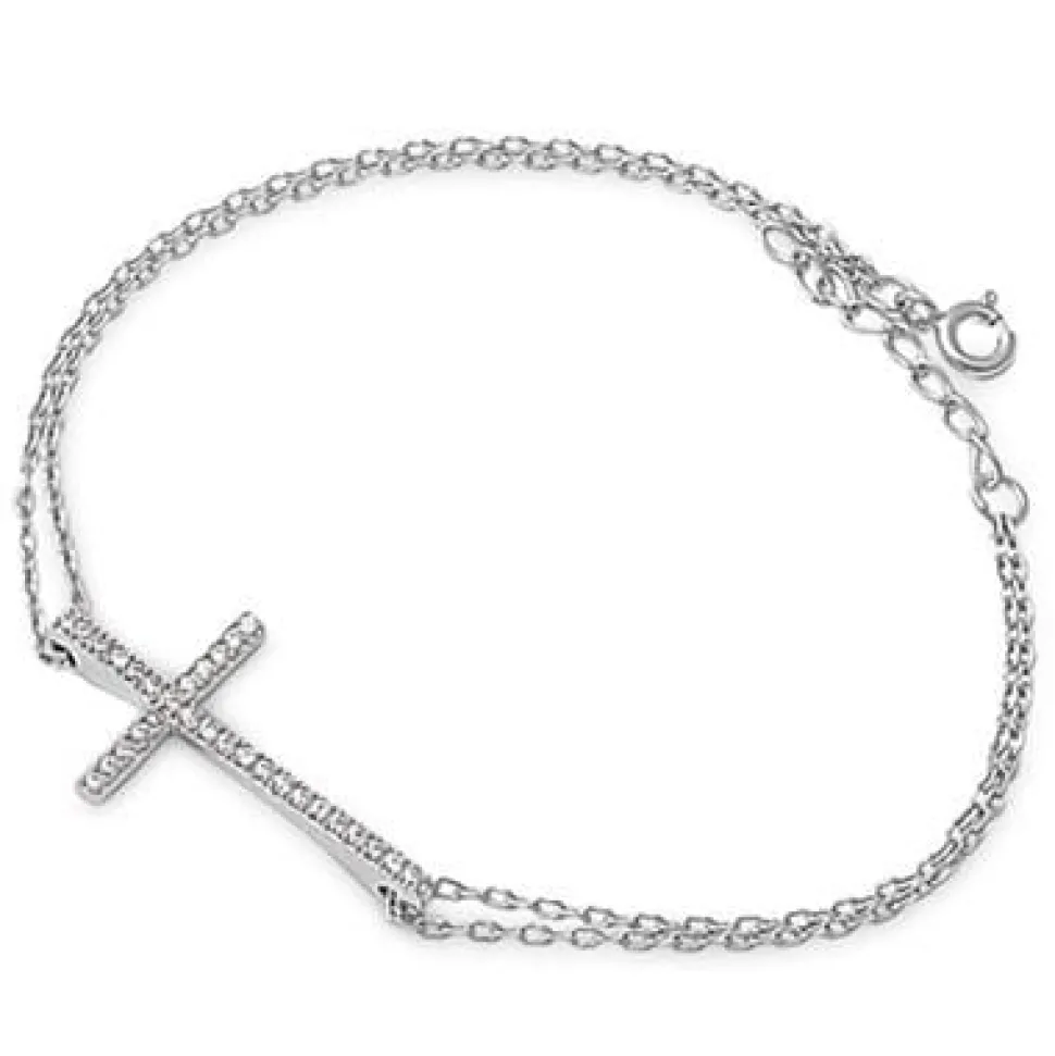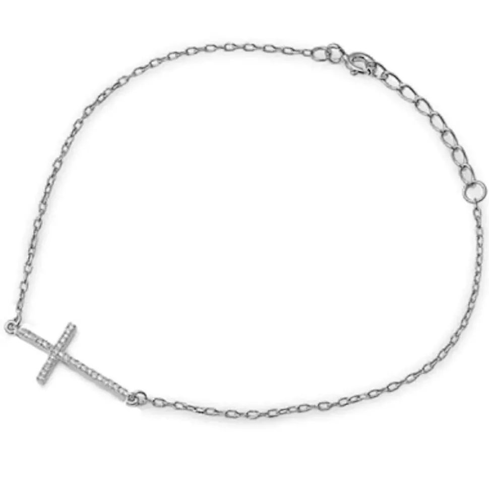 Sterling Silver Sideways Cz Cross .925 Sterling Silver Bracelet