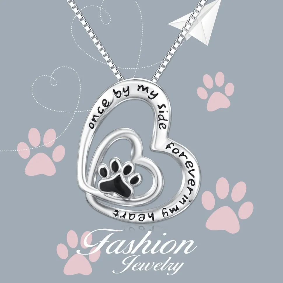 The gorgeous double heart necklace with a paw that says “Once by my Side, Forever in My Heart”, is a sweet reminder of our furry friends who are gone from our lives but never forgotten.
