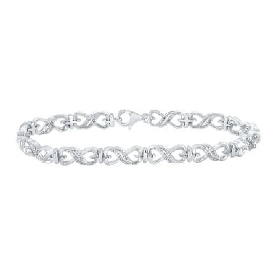 Beautiful heart-shaped infinity symbols make up this sparkling 1/10ctw diamond bracelet in affordable sterling silver. A perfect gift to show your love, give her some bling and get a lot of bang for your buck too!