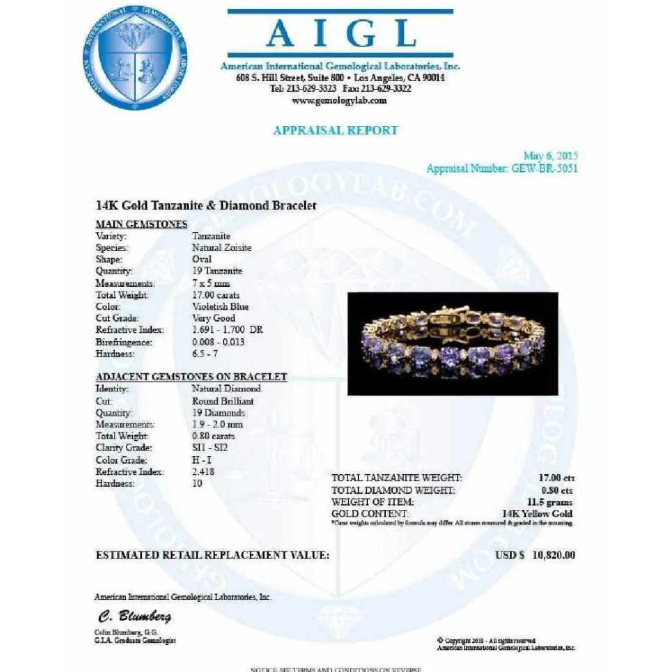14k 17.00ct Tanzanite 0.80ct Diamond Bracelet ****** Metal: 14k Solid Yellow Gold / Size: 7.5 / Total Item Weight: 11.5 grams / Country Made: United States / / Main Stone: Tanzanite / Color: Blue / Carat Total Weight: 17.00 / Treatment: None / Clarity: Type 2 / Cut: Very Good / / Secondary Stone: Diamond / Carat Total Weight: 0.80 / Treatment: None / Color Grade: H – I / Clarity: SI1 – SI2 / Cut: Very Good /