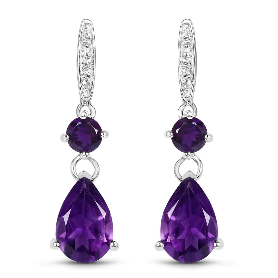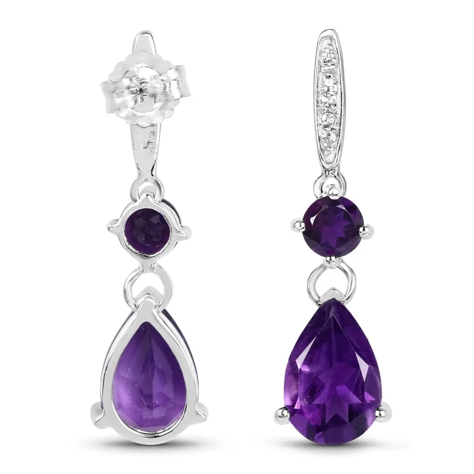 Gorgeous nearly 6ct of deep purple Amethyst Teardrop earrings with sparkling topaz in solid sterling silver plated with 18K White Gold. These will be a wardrobe favorite! Make sure to see our other Amethyst jewelry and enjoy the gem of royalty! Amethyst is the birthstone of February babies. These gorgeous earrings are approx 3mm long.