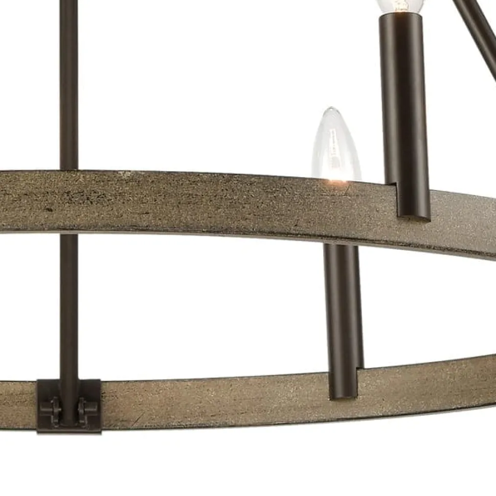 The Transitions chandelier features a streamlined ring design in a two-tone Aspen and oil rubbed bronze finish. This fixture features unique candle covers that slip directly over the ring and integrated connecting brackets that add smooth transitions from one element to another.