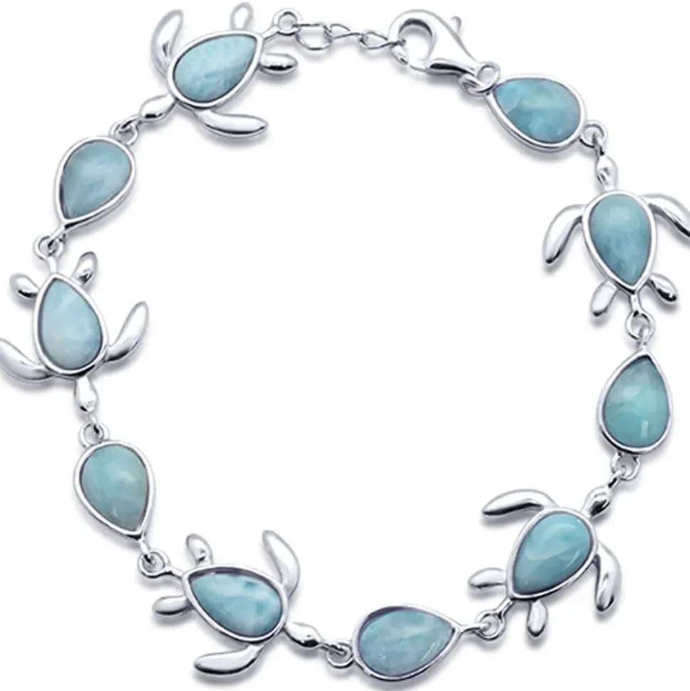 Lots of turtles for our turtle lovers! This beautiful natural Larimar bracelet is perfect for the turtle lover! Lots of Larimar turtles and fine 925 Sterling SIlver with a lobster clasp.