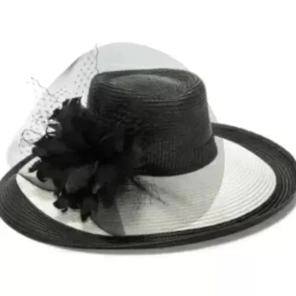 Elegant black and white large brim, romantic straw hat by August Hats. Perfect for a summer outing. Features an ivory and black straw hat with a beautiful netting and feather bow. Definitely will keep the sun out of your eyes on those bright days. Nice lightweight hat.