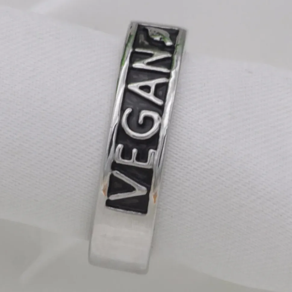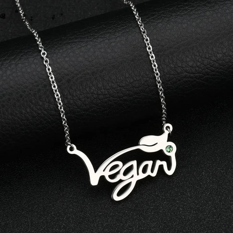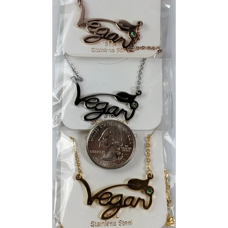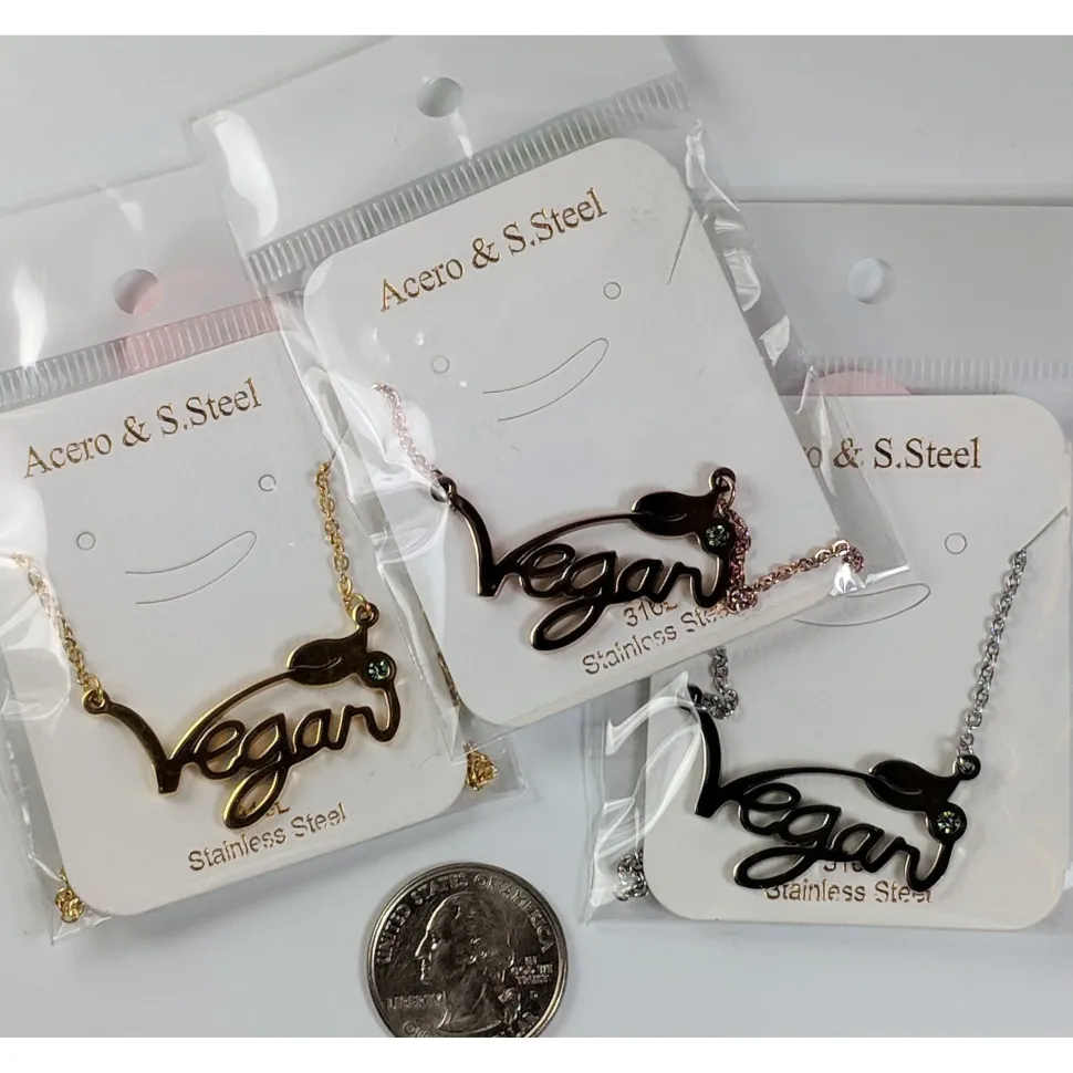Vegan Stainless Steel Necklaces! These beautiful necklaces and ring with the message of compassion on them are polished stainless steel to last for a lifetime of use! They are rose, gold and silver toned and are the perfect gift for the vegans in your life (and you! ) The ring is stainless steel colored with gunmetal gray.