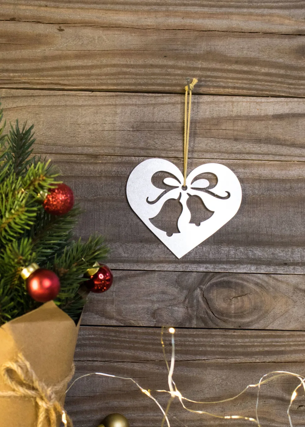 The aluminum material allows our ornaments to be light and delicate as they dangle from the twine. The tumbled grey/silver finish shines with a slight sparkle in the light. Some subtle surface variation is normal; please refer to our pictures.