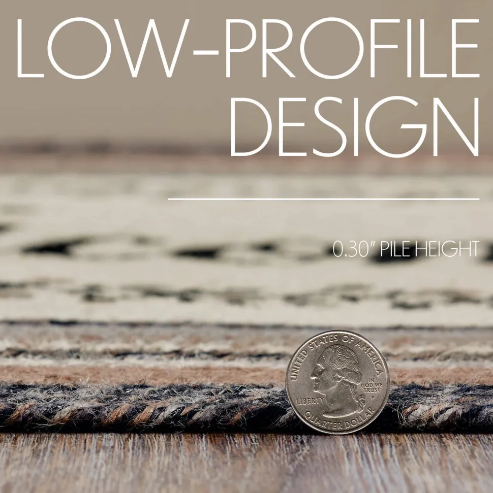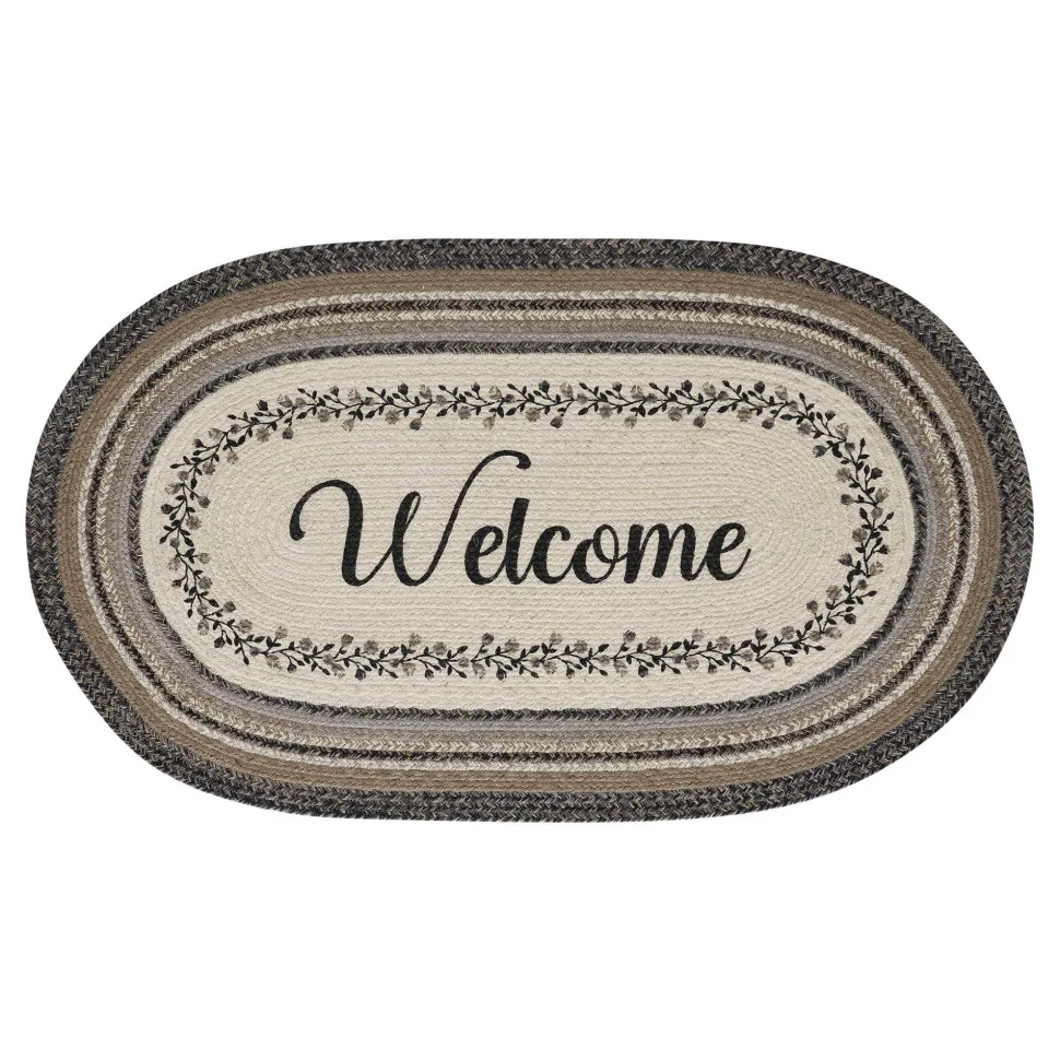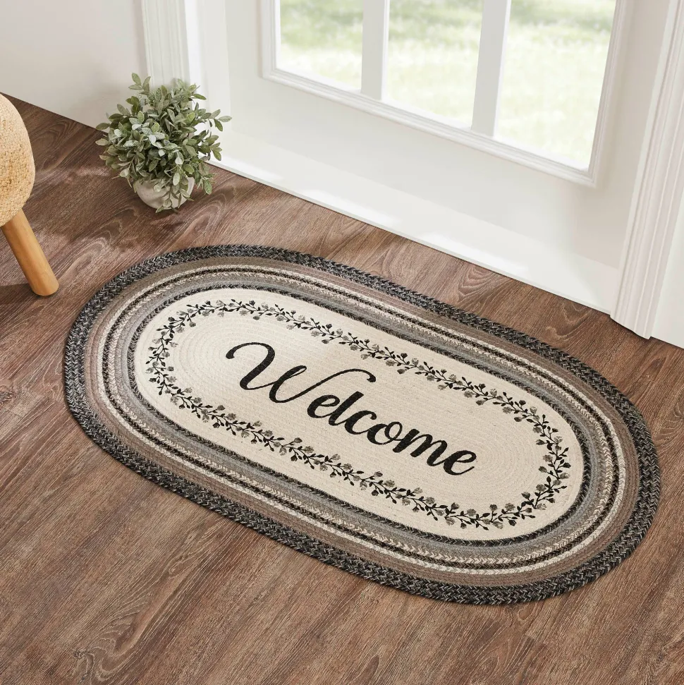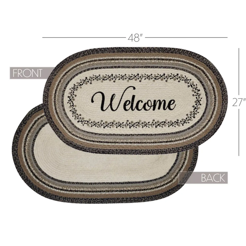 Infuse your entryway with a touch of elegance and modern charm using neutral tones and delicate flower accents on a sturdy jute rug. Welcome guests with the lovely Floral Vine Jute Oval Rug, 27×48 inches in size, featuring a classic oval shape and tightly braided design made from a durable jute blend. The unique blend relaxes quickly and stays flat, while the included PVC mat ensures the rug stays in place. The black, grey, and cream color scheme is adorned with a vine and flower motif that encircles the word “welcome,” achieving a gentle and rustic feel that beautifully complements various country-inspired decor styles. This is a beautiful design and we are proud to offer these rugs!