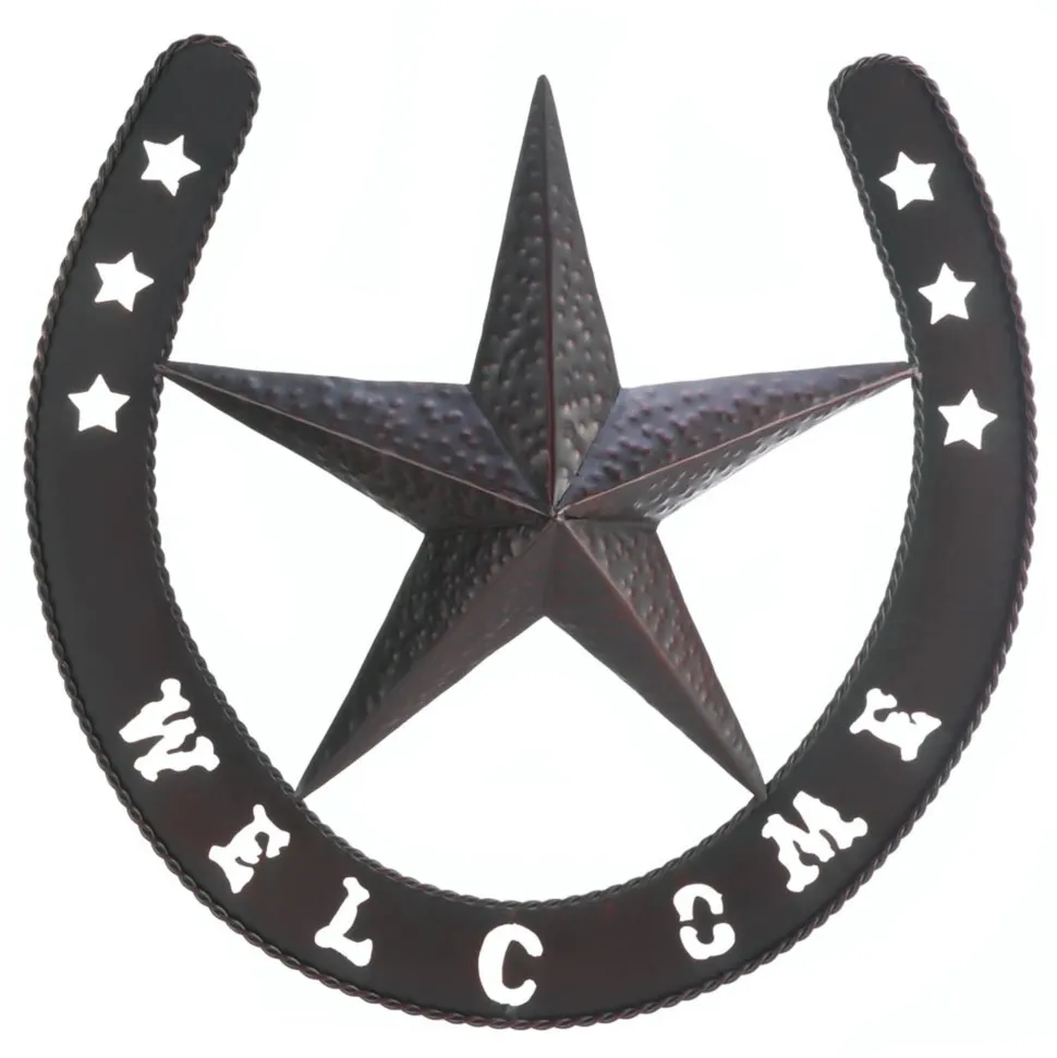 Gorgeous, BIG Western Star Wall Plaque gives your home a terrific western vibe. Indoors or outdoors, you will love this rustic welcome sign. Give your friends and family a big welcome with this striking iron wall decor. A large lone star rests inside a lucky horseshoe, emblazoned with “welcome” in Wild West style.