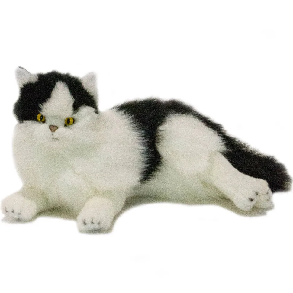 Meet Woodrow! He is a lying “Piebald” Persian cat in white and black color and is a realistic soft plush toy. He is a premium quality handmade soft long-haired cat and is very cuddly. Piebald cats are also called bicolor cats. The word “piebald” comes from “pie” (from “magpie”) and “bald” which means a white patch or spot. In addition to cats, other animals with piebald coloring include horses, dogs, birds, pigs, cattle, and even some snakes.