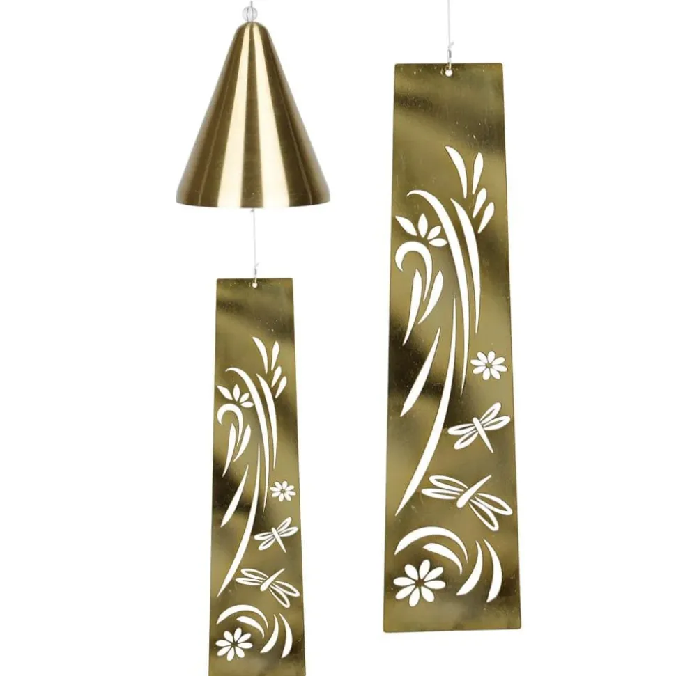 A swirl of flowers and dragonflies graces the windcatcher of this beautiful brushed brass bell. The stunning fligaree windcatcher complements the brushed brass bell, creating an accent piece that will look equally lovely indoors or out.